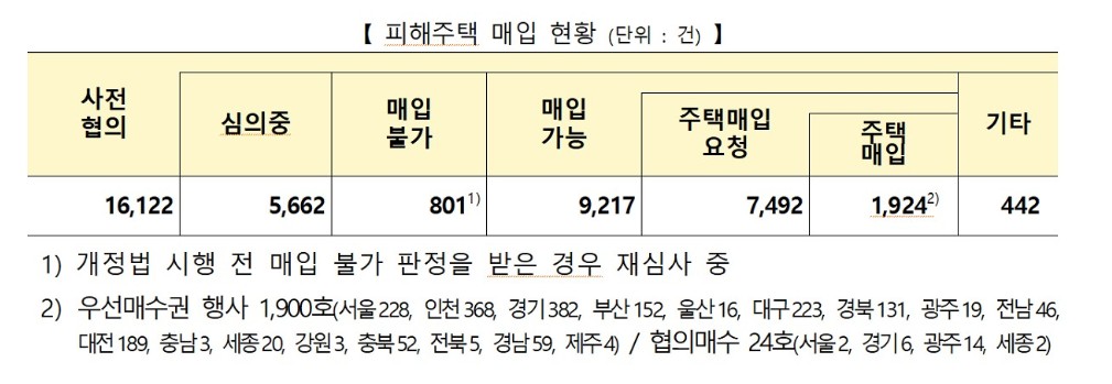 ㅇ ’25년 8월 26일 기준으로 피해자로부터 총 16,122건의 피해주택 매입 사전협의 요청이 들어왔으며, 이 중 9,217건은 현장조사 등 매입 심의가 완료되어 피해자에게 매입이 가능함을 알렸다.