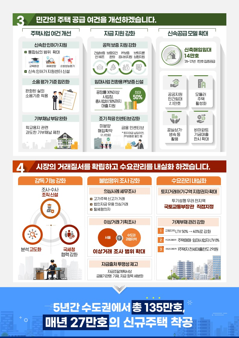 □ 김윤덕 국토교통부 장관은 “주택시장의 근본적인 안정을 위해서는 충분한 주택이 공급되는 것이 무엇보다 중요하다”며, “국민들이 주택공급에 대한 지속적인 확신을 가지실 수 있도록 하고, 공급된 주택이 실수요자들에게 공정하게 공급될 수 있는 시장 구조가 확립되도록 힘쓰겠다”고 강조했다.