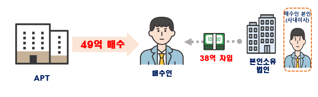 ○○ 국적 매수인은 서울시 ○○구 소재 아파트를 49억원에 매수하면서 본인이 사내이사로 있는 법인(특수관계인)으로부터 38억원을 차입함. 차입금에 대한 정당한 회계처리가 확인되지 않아 법인자금 유용의심 및 특수관계인 차입금 과다로 국세청 통보 대상 |